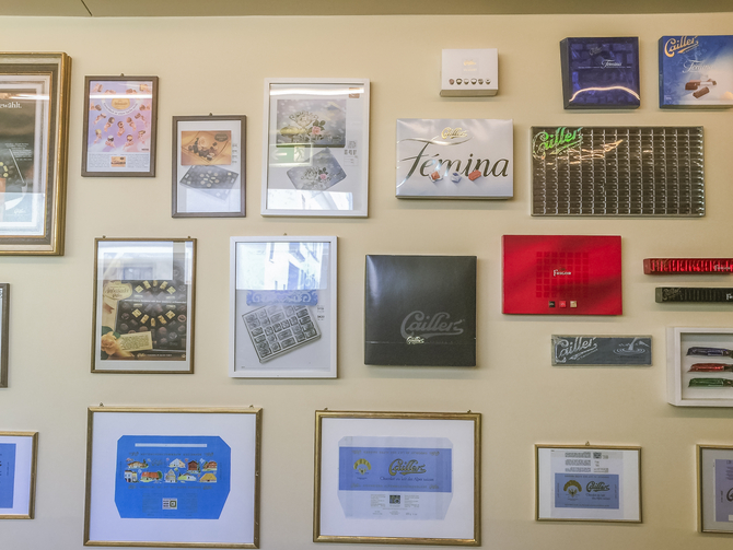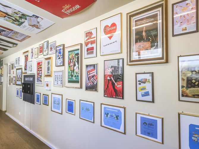 견학 출입구를 통과하고도 잠시 대기하는데 길게 이어진 복도 한쪽 벽에 의자가 있고 그 반대쪽에 사진처럼 네슬레의 역사가 담긴 상품 포장과 광고지 등을 볼 수 있다. 오른쪽 끝에 있는 화살표가 있는 박스에 오디오 가이드 기계를 가져가면 설명이 시작된다.
