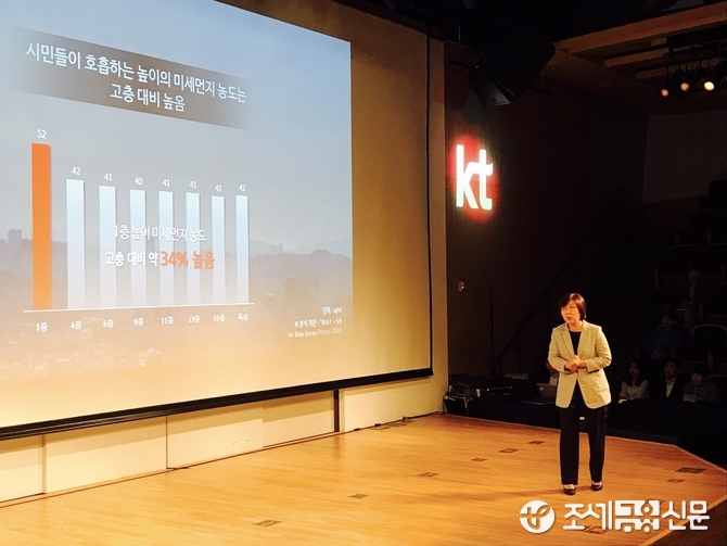 윤혜정 KT 빅데이터 사업지원단장은 “동일 행정동 내에서도 세부 위치에 따른 미세먼지 농도 차이가 확인 가능했고 층간 농도차도 최대 34%에 달했다”며 “미세먼지 농도가 높을수록 방음벽의 미세먼지 차단 효과가 컸으며 시간당 5mm 이상 강수 시 미세먼지 저감 효과가 나타났다”고 설명했다.