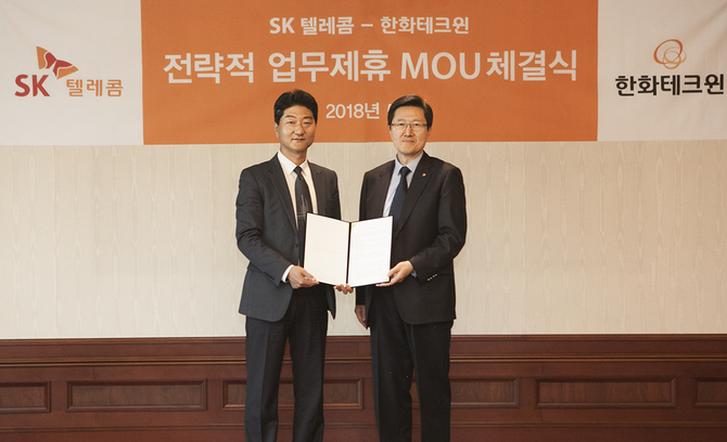 이날 한화테크윈 판교사옥에서 열린 업무협약(MOU) 체결식에는 정순구 SK텔레콤 시큐리티유닛장과 안순홍 한화테크윈 마케팅실장이 참석해 양사 협력을 다짐했다.