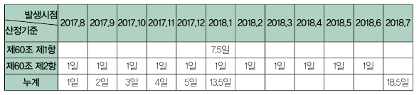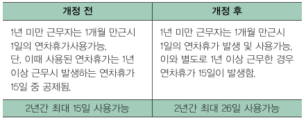 기존 연차휴가제도에서는 계속하여 근로한 기간이 1년 미만인 근로자의 경우 1개월 개근시 1일의 유급휴가를 부여하도록 하면서, 최초 1년간의 근로에 대해 유급휴가(15일)를 주는 경우, 이때 근로자가 사용한 휴가를 공제1)할 수 있도록 하였다. 그 결과, 입사한 때로부터 2년간 근로자가 사용할 수 있는 최대 휴가일수는 15일이었다.