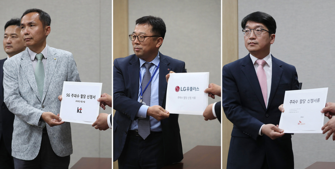 5일 업계에 따르면 이통 3사는 전날 과학기술정보통신부에 주파수 활용 계획과 재무능력을 담은 5G 주파수 할당신청서를 제출했다. KT가 이날 오후 2시에 가장 먼저 신청서를 제출했으며 이어 한시간 간격으로 LG유플러스, SK텔레콤이 각각 접수를 마쳤다.
