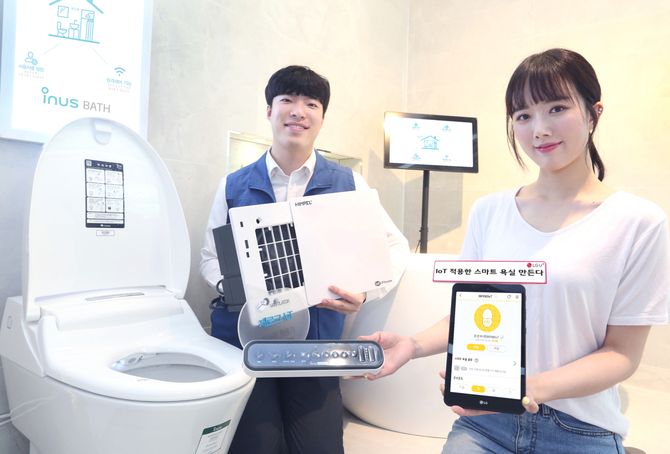 스마트 욕실 서비스는 스마트폰으로 손쉽게 제어할 수 있는 IoT 비데일체형 양변기와 환풍기가 포함돼 있는 욕실 인테리어 상품이다. 이 두 제품은 와이파이 환경이면 이통사와 상관없이 LG유플러스 홈 IoT 플랫폼인 ‘IoT@home’ 앱과 연동해 사용할 수 있다.