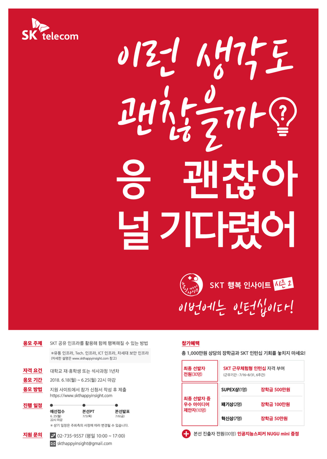 SK텔레콤은 청년들이 우리 사회의 다양한 문제 해결을 위해 자신의 참신한 아이디어와 생각을 밝히는 ‘SKT 행복 인사이트 시즌2’ 프로그램을 개최한다고 18일 밝혔다. 이번 주제는 ‘SK텔레콤 공유 인프라를 활용해 함께 행복해질 수 있는 방법’이다.