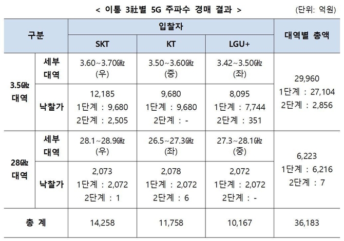 3.5GHz 대역의 총 낙찰가는 블록당 968억원씩 총 2조9960억원으로 경매 시작가(2조6544억원)보다 3416억원 올랐지만 시장 예상대로 4조원을 밑돌았다. 업체별로는 ▲SK텔레콤 1조2185억원 ▲KT 9680억원 ▲LG유플러스 8095억원에 각각 주파수를 획득했다.