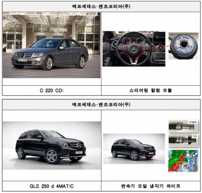 벤츠 C클래스 220 CDI 등 25개 차종 8929대는 조향장치 내 전기부품(스티어링 칼럼 모듈)의 결함으로 사고가 발생하지 않아도 에어백이 작동할 개연성이 확인됐다.