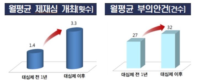 평균 회의 시간은 증가했다. 대심제 시행 이후 제재심 평균 회의 시간은 4시간 15분으로 직전 1년 평균치보다 35분 증가했다. 대회의 기준으로는 1시간 25분 증가했다. 1건당 평균 진술인 수도 4.6명에서 7.4명으로 크게 늘어났다.