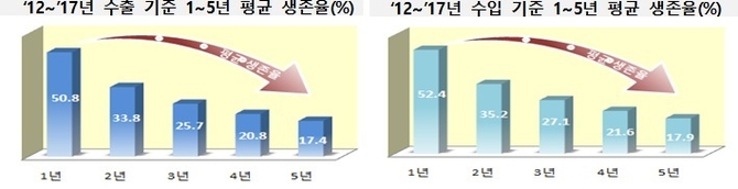 이렇게 무역 시장에 진입한 기업의 1년 생존율은 평균 50%를 상회하는 수준이며, 5년 생존율은 평균 17%를 상회해 연차가 커질수록 생존율은 점차 하락하는 모습을 보였다.