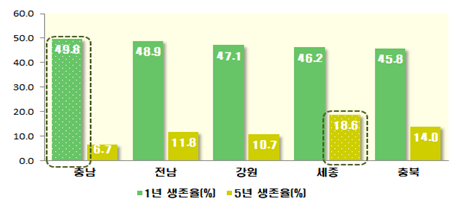 특히 세종지역의 5년 생존율은 수출 18.6%, 수입 30.4%로 다른 지역에 비해 상대적으로 높은 생존율을 기록했다.