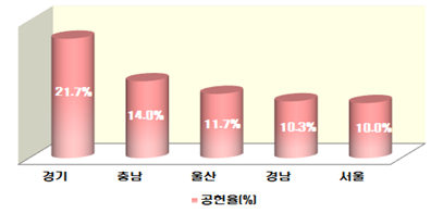 자료에 따르면 지역별 수출은 경기도가 27.7%, 충청남도 14.0%, 울산이 11.7%로 상위 3개 지역이 우리나라 전체 수출의 약 50% 정도를 차지하는 것으로 나타났다.
