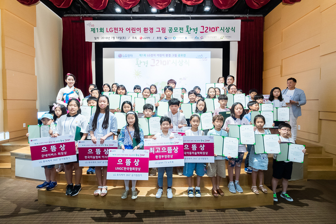 LG전자는 전날 여의도 LG트윈타워에서 ‘제1회 LG전자 어린이 환경 그림 공모전’ 시상식을 개최했다. 지난 5월 초에 시작한 공모전에는 약 6700점의 작품이 접수됐다.