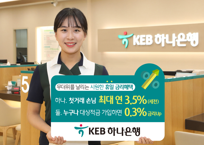 기존 고객들을 위한 이벤트도 진행된다. 비대면채널 적금상품 중 ▲하나멤버스 주거래 우대적금 ▲셀프-기프팅 적금 ▲Young하나 적금 등의 특정상품을 휴일에 가입할 경우 각 상품별로 0.3%p의 우대금리를 추가로 더 받을 수 있다.
