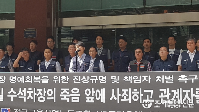 18일 오전 서울 여의도 국민은행 본점 앞에서 ‘명예회복을 위한 진상규명 및 책임자 처벌 촉구 기자회견’을 실시한 국민은행 노조는 “고인의 죽음에 직접적인 연관이 확인된 지역영업그룹 대표를 즉시 해임하고 책임자는 유가족과 노조 앞에 공식 사과를 해야한다”며 “이와 함께 스타팀 운영방식과 제도를 개선해야 한다”고 주장했다.