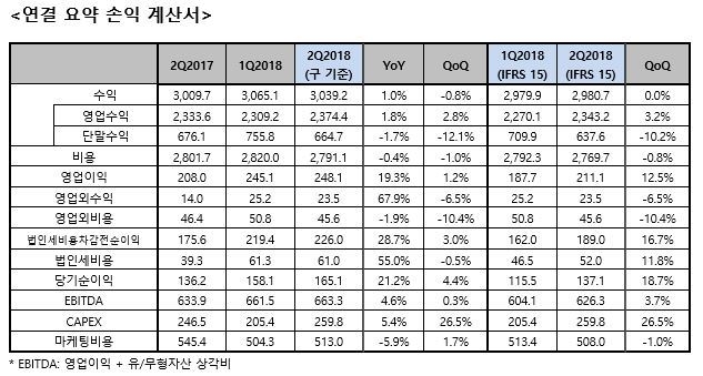 LG유플러스는 새로운 회계기준(K-IFRS 1115호)을 적용한 올해 2분기 연결기준 매출이 2조9807억원, 영업이익 2111억원, 당기순이익 1371억원을 기록했다고 26일 공시했다. 또 영업수익은 2조3432억원을 기록했으며 단말수익은 6376억원을 달성했다.