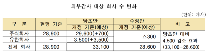 입법예고 당시 금융위는 새로운 시행령 개정에 따라 외부감사 대상 법인은 주식회사 700개, 유한회사 3500개 등 4200개가 늘어나게 될 것이라고 추산했다.