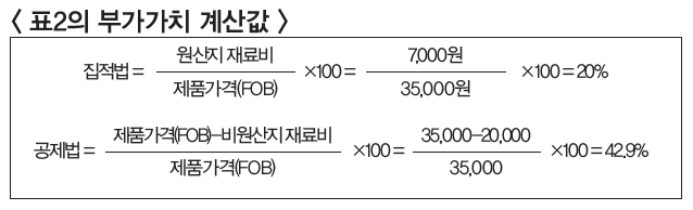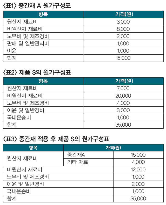 상기 원가구성표<표 2>와 같이 중간재를 적용하지 않는 일반적인 원가내역대로라면 역내부가가치율 직접법 20%와 공제법 43%가 계상된다. 이는 S의 원산지 기준인 직접법 30%, 공제법 45% 미치지 못하여 역외산으로 판정되고 따라서 FTA활용은 요원해진다.