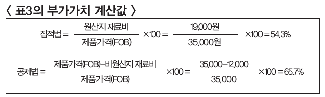 그러나 중간재료인 A를 직접 생산하고 있다는 프로세스에 착안하여 이를 특례기준인 중간재를 적용해보면 상기한 <표3>과 같이 원가 구성체계가 유리하게 조정됨을 알 수 있다. 즉 중간재인 A에 소요된 역외산이었던 원재료가 롤업(Roll Up)되면서 애초에 역내산이었던 원재료뿐만 아니라 역외산 원재료도 함께 모두 역내산으로 전환된다.