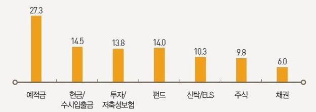 향후 투자처로는 예·적금이 27.3%로 가장 높은 응답률을 기록했으며 현금·수시입출금이 14.5%로 그 뒤를 이었다. 펀드(14%)와투자·저축성보험(13.8%)도 높은 수치를 보였다. 신탁·ELS(10.3%), 주식(9.8%),채권(3%) 등은 상대적으로 낮은 선호도를 기록했다.