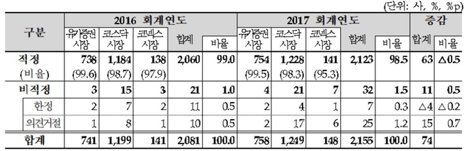 7일 금융감독원이 발표한 자료에 따르면 상장법인 2155개사의 감사보고서(2017 회계연도) 중 ‘적정’ 감사의견을 받은 상장사의 수는 2123개사로 나타났다. 이는 전체 상장사 중 98.5%에 해당하는 수치다. 적정 감사의견의 비율은 전기(99%) 대비 소폭 하락했다.