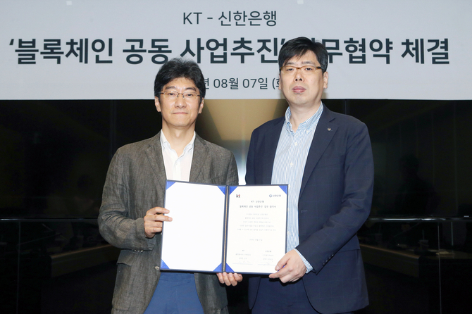(조세금융신문=이기욱 기자) 신한은행이 지난 7일 서울 중구 KT 사옥에서 KT와 블록체인 공동 사업 추진을 위한 업무협약을 체결했다고 8일 밝혔다.
