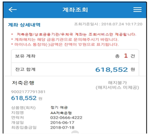 금감원 금융소비자 정보 포털 ‘파인’에서 ‘내 계좌 한눈에’ 메뉴를 선택하거나 모바일 전용앱에 로그인해 ‘저축은행‧상호금융‧우체국’을 선택하면 계좌 조회 서비스를 이용할 수 있다. 저축은행에서 가입한 수시입출금, 정기 예‧적금 상품의 잔액 등 수신계좌 정보가 요약정보와 상세정보로 구분해 제공된다.