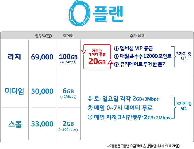라지 이용자는 월 6만9000원에 데이터 100GB를 받는다. 이 중 20GB는 가족과 공유할 수 있고 데이터를 소진해도 최대 5Mbps 속도로 계속 이용할 수 있다. 이는 기존 T플랜 라지 요금제에는 없던 혜택이다.