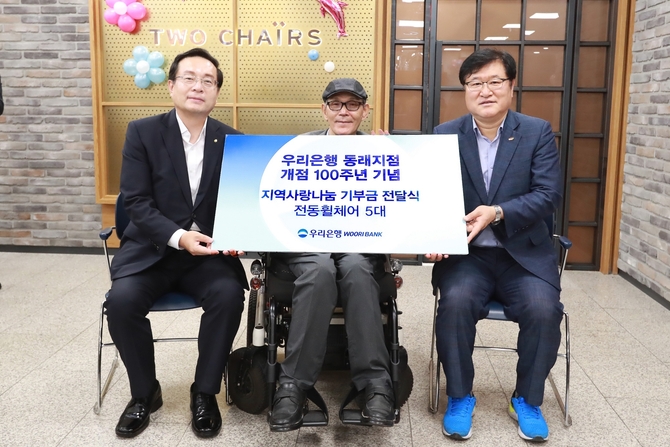 우리은행은 이날 그동안 함께해 온 지역사회에 보답하기 위해 동래구장애인협회에 장애인전동휠체어 5대 구입자금을 기부하기도 했다.