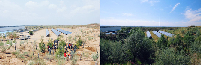 한화그룹 관계자는 “‘환경을 해치지 않으면서 기후변화를 막을 수 없을까’라는 고민 끝에 태양광 발전설비를 묘목장에 설치했다”며 “태양광으로 사막화 방지 활동을 한 세계 최초의 사례로 UN 사막화방지협약(UNCD) 총회에도 소개되기도 했다”고 설명했다.