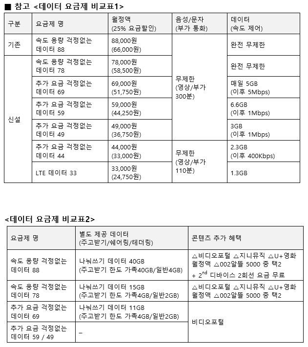 월정액 5만9000원의 ‘추가 요금 걱정 없는 데이터 59’와 4만9000원의 ‘추가 요금 걱정 없는 데이터 49’도 각각 6.6GB와 3GB의 데이터를 기본 제공하며 데이터 소진 후에는 1Mbps(SD급 화질) 속도로 서비스를 지속 이용할 수 있다.