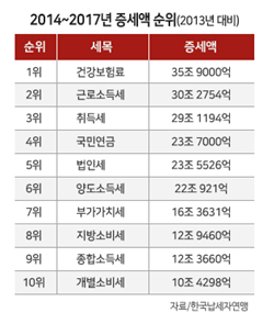 2014년부터 2017년까지 증세액의 세목별 순위로는 건강보험료가 35조9000억원으로 가장 많았다.