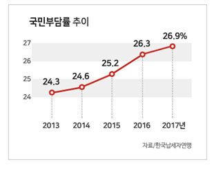 우리나라 국민부담률은 2013년 24.3%를 기록한 이후 매년 증가하는 추세로 지난해 국민부담률은 2013년에 비해 2.6% 상승했다.