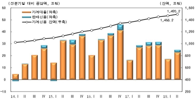 23일 한국은행이 발표한 ‘2018년 2분기 가계신용’에 따르면 지난 2분기말 기준 가계신용 총 잔액은 1493조2000억원으로 나타났다. 가계대출이 1409조9000억원을, 판매신용(외상판매)이 83조2000억원을 기록했다.