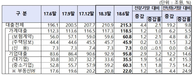30일 금융감독원이 발표한 ‘2018년 6월말 보험회사 대출채권 현황 분석’에 따르면 6월말 기준 보험사의 대출 채권 잔액은 215조3000억원을 기록했다. 지난 분기(210조9000억원) 대비 4조4000억원(2.1%) 증가했다.