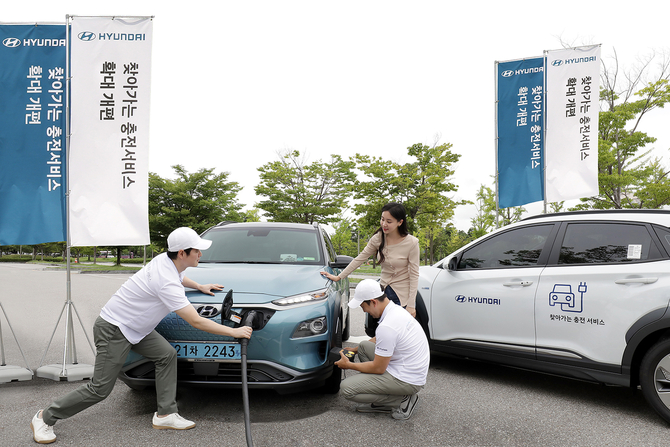 찾아가는 충전 서비스는 현대자동차의 전기차를 이용하는 고객이 원하는 시간과 장소에서 서비스를 요청하면 전담 직원이 고객에게 직접 찾아가 무료(연 4회)로 충전을 해주는 서비스다.