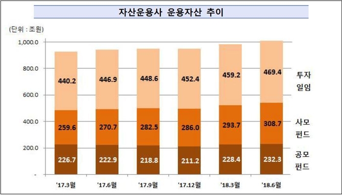 5일 금융감독원이 발표한 ‘자산운용사의 2018년 2분기 중 영업실적’에 따르면 6월 말 기준 자산운용사의 총 운용자산은 1010조원으로 나타났다. 1분기(981억원) 말 대비 3% 증가한 수치다.