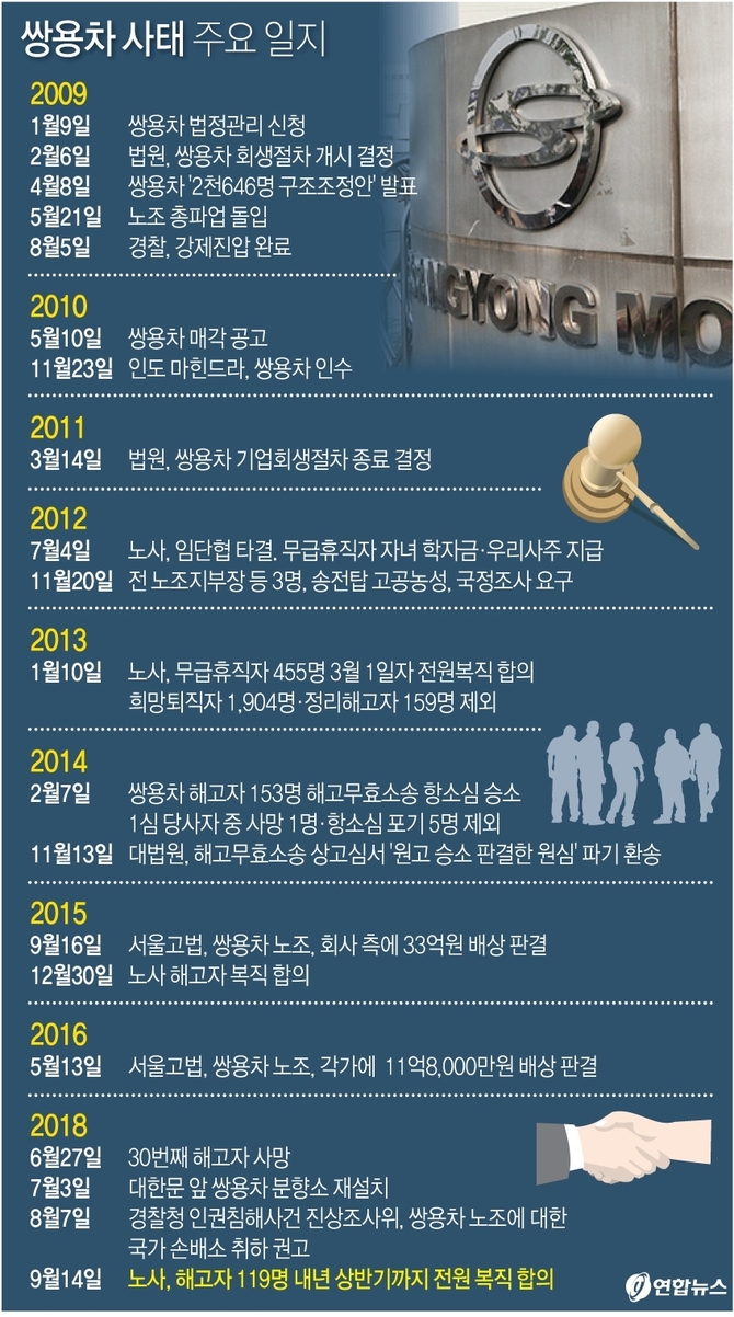 쌍용자동차는 지난 13일 경제사회노동위원회 사무실에서 노·노·사·정 대표가 참석한 가운데 해고자 복직 방안을 합의함에 따라 지난 10년간의 해고자 복직문제를 종결짓게 됐다고 14일 밝혔다.