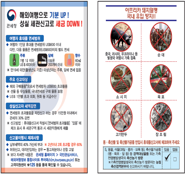 관세청은 이 기간 해외 여행자들의 휴대품 자진신고와 아프리카 돼지열병 국내 유입 방지를 위한 돈육과 돈육가공품(소세지, 만두, 순대, 육포 등)의 휴대반입 금지에도 적극 협조해 줄 것을 당부했다.