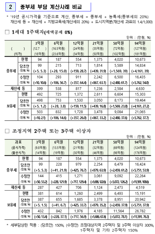먼저, 1세대 1주택자인 경우 세액은 다음과 같다. (출처: 정부 발표자료)