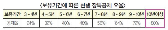 앞으로는 2년 미만 거주 시 15년을 넘게 보유해도 30% 정도의 공제만 받게 되며, 2년 이상을 자가소유주택에서 거주해야 장특공제를 받을 수 있다. 적용은 1년간 유예기간을 두어 2020년 1월 1일 양도분부터 적용한다.