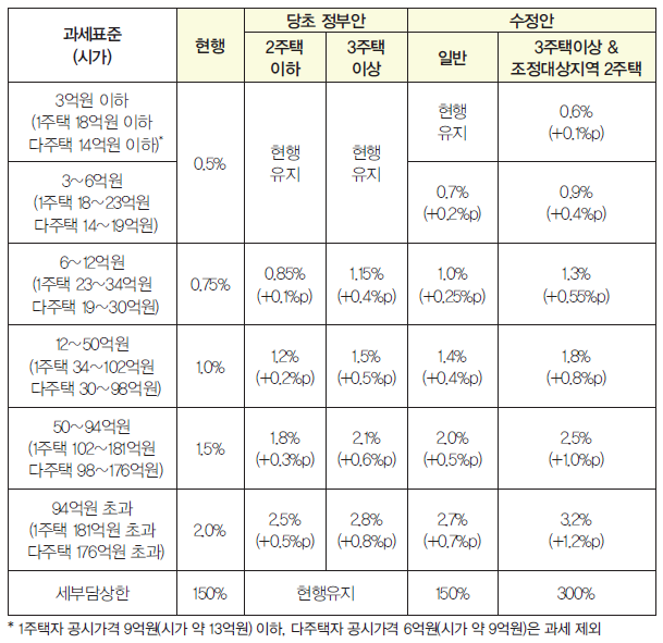 3~6억원 구간을 신설해 0.7%의 세율을 적용하고, 6~12억원은 1.0%, 12~50억원은 1.4%, 50∼94억원은 2.0%, 과표 94억원 초과는 2.7%까지 끌어 올린다. 조정대상지역에 한해 종부세 0.5% 중과를 2주택이상자까지 확대한다.