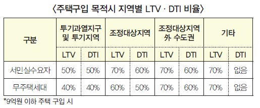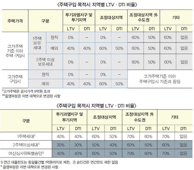 1주택·2주택 세대는 조정대상지역 내 신규주택을 살 경우 주택구입목적의 주택담보대출이 전면 금지된다. 실거주 목적을 제외하고 조정대상지역 내 공시가격 9억원 초과 고가주택 구입 시에는 주택담보대출이 금지된다.