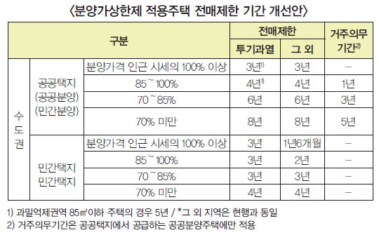 다만, 민간택지에 공급되는 분양가상한제 주택은 공공택지공급 주택 전매 제한 기간의 50%만 부과하고, 거주의무 기간은 부여하지 않을 계획이다.