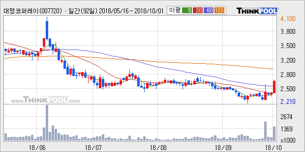 기업소모성 자재 구매대행 및 영상보안장비 제조업체인 대명코퍼레이션[007720]은 1일 오전 11시 3분 현재 전일 거래량의 201.1% 수준으로 거래량이 크게 증가하며, 전날보다 7.66% 오른 2600원에 거래되고 있다.