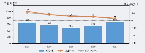 최근 실적을 살펴보면 2017년 매출액이 최근 5년 중 가장 높은 실적을 기록했음을 알 수 있다. 이전 최고 실적이었던 2013년 보다도 1.3%(8억 7천만원) 늘어난 것으로 나타났다.