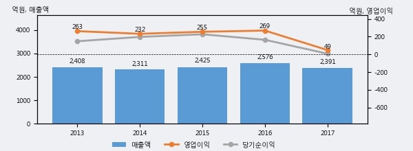한국카본의 2017년 매출액은 2391억으로 전년대비 -7.2% 하락했고, 영업이익 역시 49억으로 전년대비 -81.9% 하락했다. 이 회사의 매출액 증감률과 영업이익 증감률은 각각 코스피 하위 15%, 하위 12%에 해당된다.