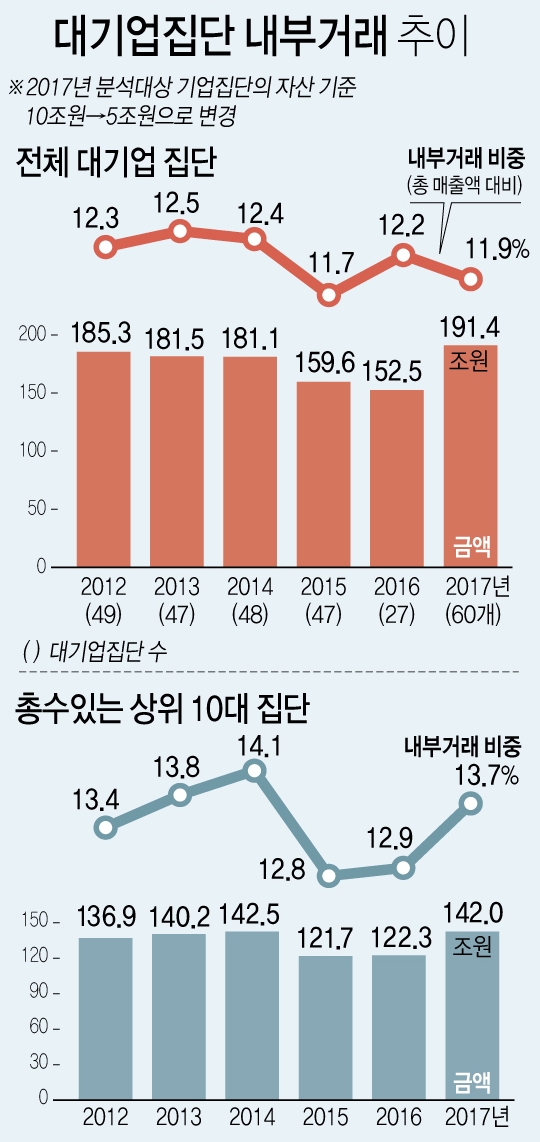 작년과 올해 연속으로 분석 대상에 포함된 집단 27개를 보면 작년 내부거래 비중은 12.8%로 2016년과 비교했을 때 0.6%포인트 늘었고, 금액도 174조3000억원으로 21조8000억원 증가했다.