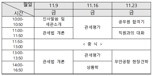 아카데미는 관세사 자격증과 관세직 공무원 시험과목을 대상으로 11월 9일, 16일, 23일 총 3회에 걸쳐 조선대학교에서 진행된다.