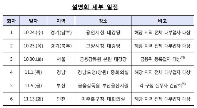 금감원은 “전국 순회 설명회 개최 후 업계의 호응도와 해당 지자체의 의견 등을 파악해 실시 지역은 동 설명회 개최를 정례화하고 미실시 지역은 추가 수요 조사를 진행해 대상지역을 확대할 계획”이라고 밝혔다.