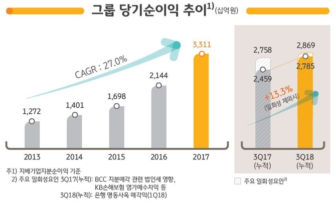 KB금융이 25일 발표한 ‘2018년 3분기 실적’에 따르면 KB금융은 2조8688억원의 누적 당기순이익을 기록했다. 이는 지난해 동기 대비 4% 증가한 수치다. 일회성 요인을 제외했을 경우 실적 상승률은 13.3%에 달한다.