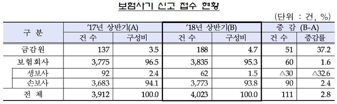 상반기 중 보험사기 제보 건수는 4023건으로 지난해 보다 2.8% 늘어났으며 대부분 손해보험사(93.8%)로 접수됐다. 생·손보협회와 보험회사는 보험사기 적발에 기여한 우수 제보 3925건에 대하여 13억1000만원의 포상금을 지급했다. 이는 지난해보다 5%(6000만원) 증가한 수치다.