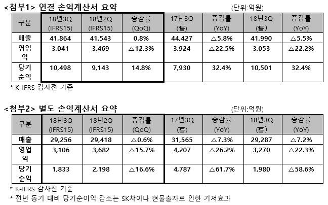 같은 기간 당기순이익은 32.4% 늘어난 1조498억원으로 사상 최초로 분기 기준 1조원을 돌파했다. 자회사 SK하이닉스의 기록적인 실적에 따른 지분법 이익이 반영된 결과다.